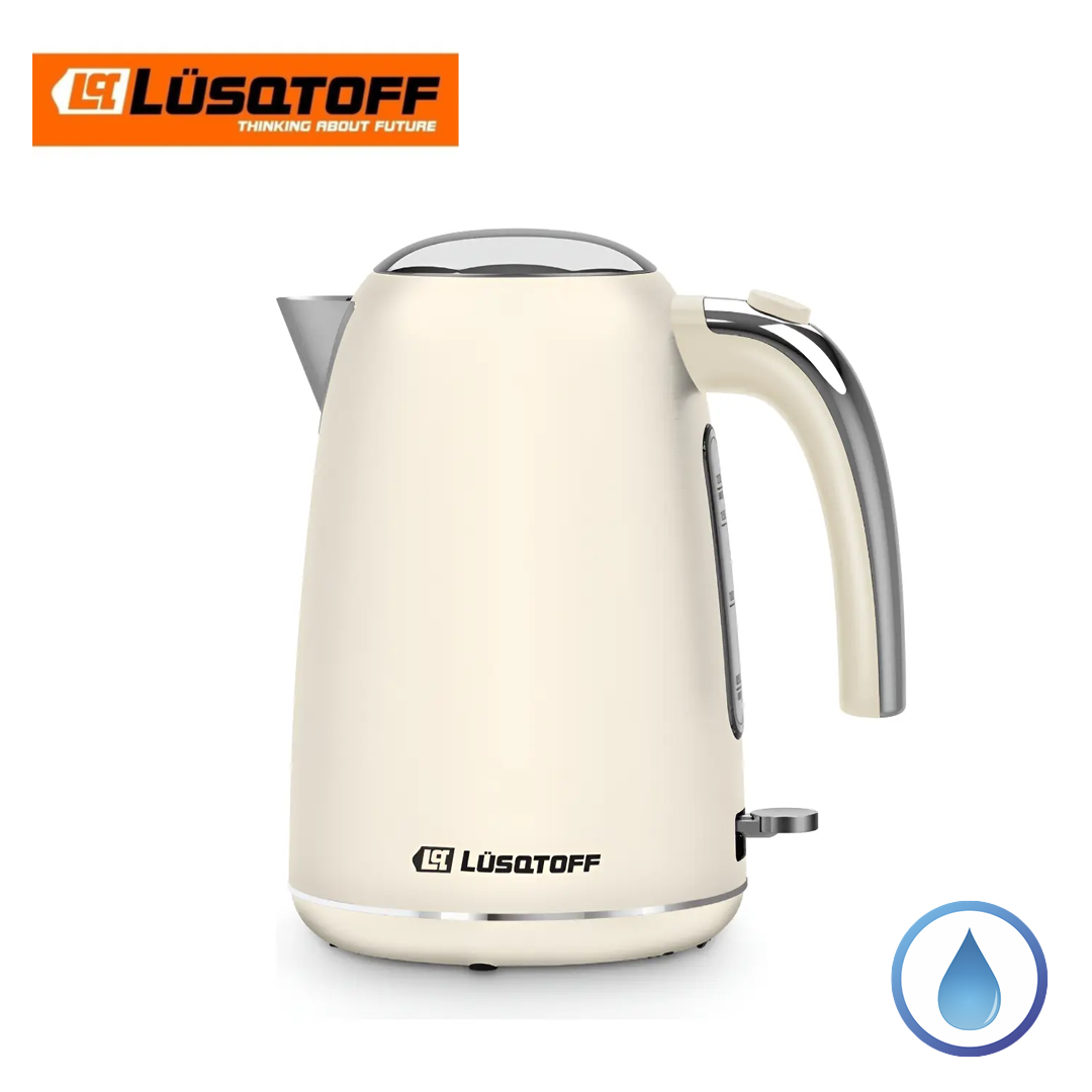 Datos Técnicos · Marca: Lüsqtoff · Modelo: LQ-PV802 · Potencia: 2200w · Color: Crema · Capacidad de 1,7 lts Descripción: - Base giratoria 360° con conexión central - Asa ergonómica - Resistencia oculta - Nivel de agua visible - Filtro extraíble - Fácil limpieza - Apagado automático - Botón para apertura de la tapa - Interruptor de encendido y apagado - Alojamiento para el cable.